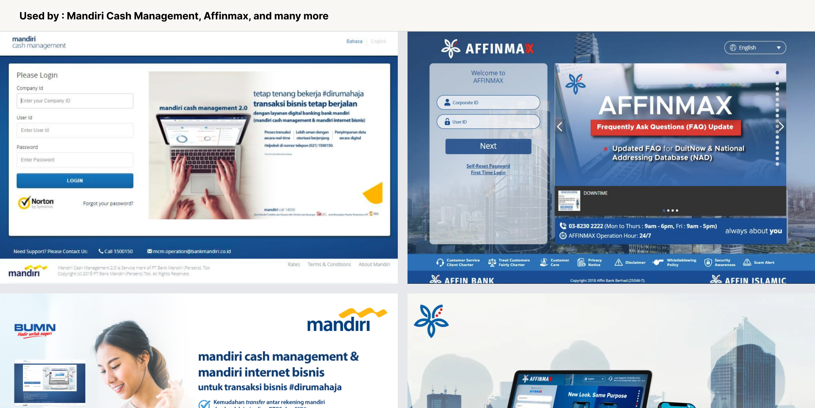 Used by multiple banks in Indonesia (50%+ Market share leader in corporate transaction banking software solutions), Malaysia, and Vietnam
