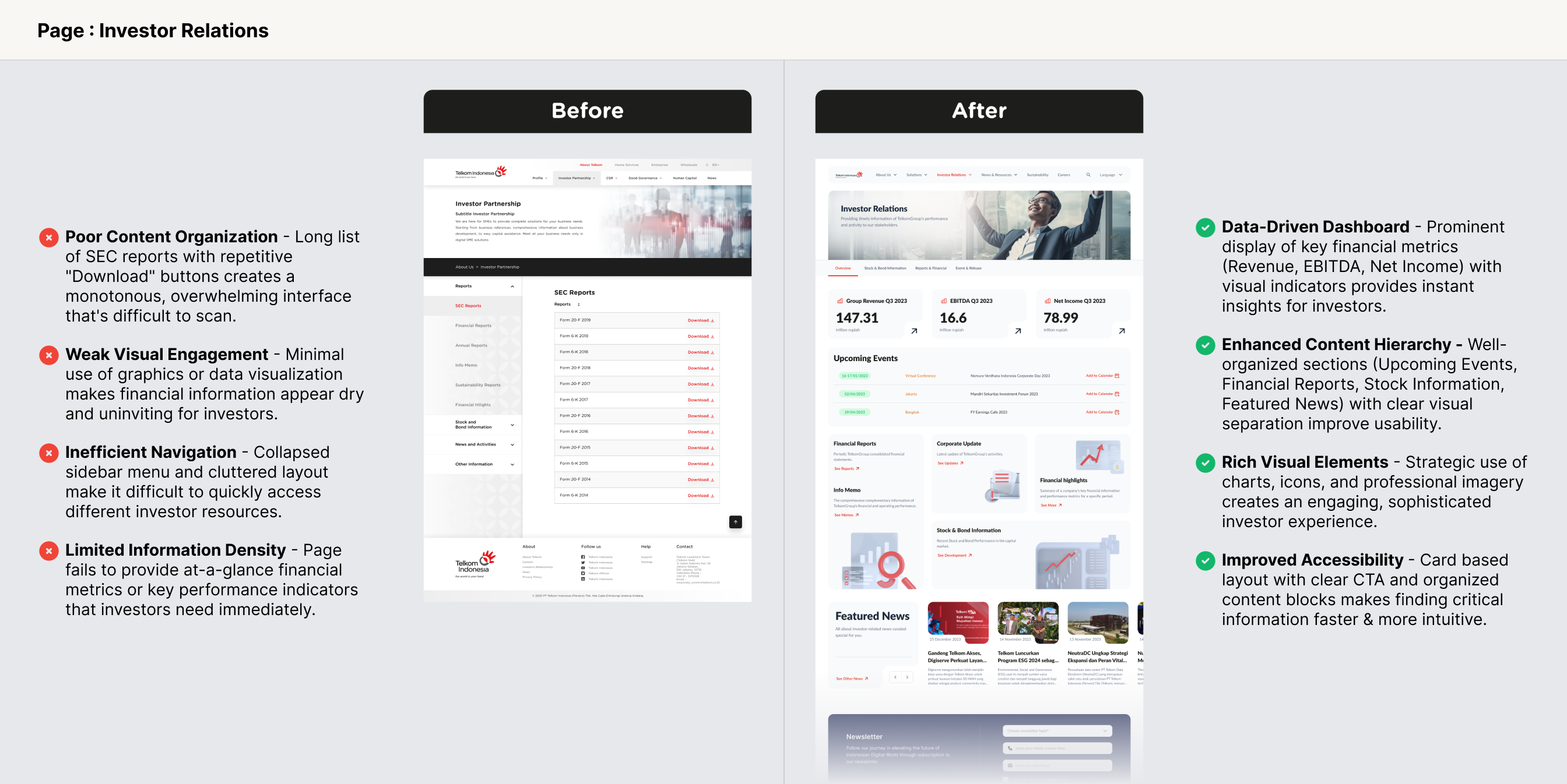 Misalignment with shareholder needs, especially access to financial information, high demand but difficult access to media and investor content, an overly complex navigation structure, a design that failed to reflect Telkom’s digital identity, content that was hard to understand due to internal jargon, and a general lack of clarity about Telkom’s products and solutions.